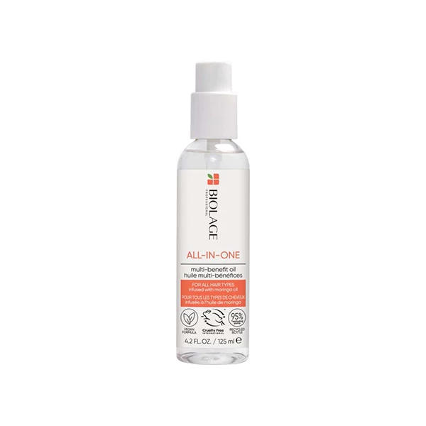 Huile végane Multi-bénéfices All in one Biolage infusée d’huile de moringa, qui permet une absorption rapide, nourrit et hydrate tous les types de cheveux sans les alourdir.